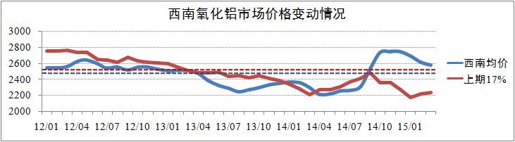 西南市場方面,在經歷半年的價格上浮之后,目前全國氧化鋁市場價格出現了整體回落趨勢,其中西南價格回落趨勢較為明顯。2015年1-3月,西南氧化鋁均價分別為2687元/噸、2611元/噸和2576元/噸,月化環比回落為2%左右。從價格變動趨勢上看,預計今年第二季度西南氧化鋁市場價格將下探至2520元/噸的平均水平線,低于全國現貨均價,但整體價格波動水平保持相對穩定。