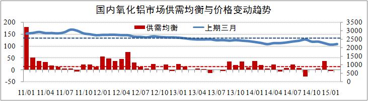 市場供給方面,2015年1-2月,全國氧化鋁市場供給分別為486萬噸和445萬噸,其中進口氧化鋁合計70萬噸,出現了較大幅度回落。近幾年數據顯示,進口氧化鋁對國內氧化鋁市場供給的貢獻率基本穩定在9%左右,預計該貢獻率將下降至7%左右。總體而言,國內氧化鋁市場供需整體處于理論均衡狀態,但上海期貨交易所三月長單價與2570元/噸的均價出現了較大程度的偏離。
