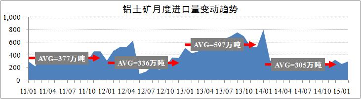 自2014年2月以來,我國鋁土礦進(jìn)口量增長一直保持在較低水平。監(jiān)控?cái)?shù)據(jù)顯示,2015年1-2月份進(jìn)口量分別為260萬噸和300萬噸,預(yù)計(jì)進(jìn)口量水平基本與2014年保持一致,全年月度平均進(jìn)口305萬噸。當(dāng)期,山東宏橋、中鋁國貿(mào)和信發(fā)鋁業(yè)成為主要進(jìn)口企業(yè),進(jìn)口量合計(jì)占比85%;澳大利亞、印度和馬來西亞則是主要進(jìn)口原產(chǎn)地,當(dāng)期合計(jì)占比高達(dá)91%。