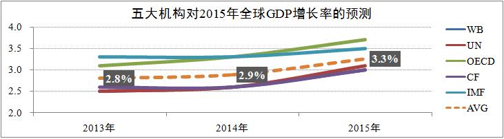 根據世界銀行(World Bank)、聯合國(United Nations)、經濟合作與發展組織(OECD)、英國共識公司(Consensus Forecasts)及國際貨幣基金組織(IMF)等五大國際權威機構的預測,2015年全球經濟形勢整體好于2014年,下半年全球經濟增速將會有較為顯著的回升,其中主要得益于全球貿易的逐步增長、通貨膨脹及失業率的繼續走低,預計全年全球GDP加權平均增速為3.3%,較2014年提升0.4個百分點。