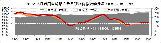 發稿時間:2015-06-17市場運行低位偏冷。市場供給方面,5月份我國電解鋁產量為256萬噸,環比基本持平,同比增長12%,市場供給穩定。現貨價格方面:5月份電解鋁現貨價格基本擺脫了年初快速下滑的頹勢,目前國產現貨價格基本穩定在13000元/噸-13150元/噸的區間范圍。從價格波動趨勢上看,5月份電解鋁現貨市場價格略高于去年同期水平,但尚未出現季節性反彈跡象。