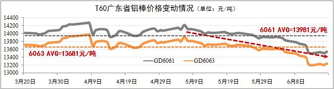 發(fā)稿時(shí)間:2015-06-17鋁棒現(xiàn)貨價(jià)格明顯下浮。截至6月17日,廣東6061棒價(jià)格下浮至13545元/噸,6063棒價(jià)格下浮至13245元/噸,兩者均低于60天(T60)均價(jià)超過(guò)400元/噸。鋁棒價(jià)格迅速下浮主要受原鋁市場(chǎng)價(jià)格下浮的影響。隨著鋁材生產(chǎn)旺季的到來(lái)以及鋁材出口的增長(zhǎng),預(yù)計(jì)鋁棒下浮趨勢(shì)于7月初出現(xiàn)溫和反彈,省內(nèi)6061棒及6063棒的價(jià)格回歸至T60均價(jià)水平的可能性較大。