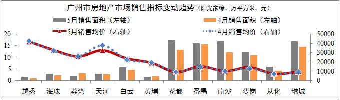 住宅銷售市場企穩回升。網簽數據:5月份廣州市住宅銷售套數為8735套,環比增長17.2%;銷售面積為102.37萬平方,環比增長22.3%;銷售均價為14232元/平方,環比小幅下降2.1%。