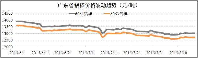 鋁棒市場價格持續下浮截至8月20日,廣東省6061棒價格下浮至12,925元/噸,6063棒價格下浮至12,625元/噸,月化環比均下降1.5%。鋁棒價格下浮主要受原鋁市場價格下浮的影響,但鋁材生產旺季需求及鋁材出口穩定增長因素將會對鋁棒價格形成有力支撐,預計6061棒的價格區間將回升在T60的水平(T60=13,300元/噸)。