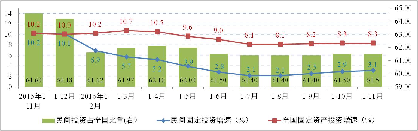 據國家統計局統計數據顯示,2016年1-11月,全國固定資產投資同比名義增長8.3%,基本呈現橫向上升態勢但增速較小,對應了經濟的L型特征。民間固定資產投資同比名義增長3.1%,增速環比上升0.2個百分點。民間固定資產投資占全國固定資產投資(不含農戶)的比重為61.5%,與上月持平。
