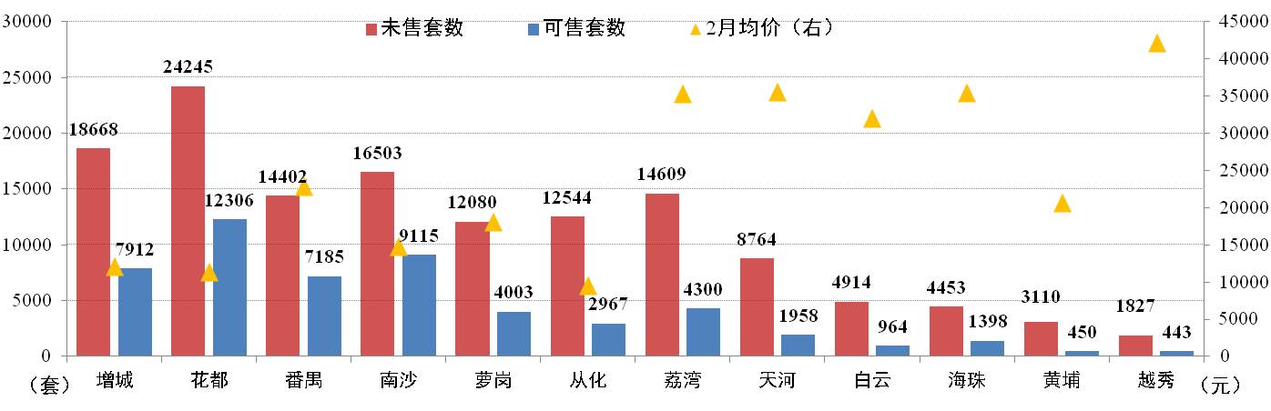 截止2月28日,廣州市新建住宅商品房共189,120套,環(huán)比減少0.83%。其中可售和未售房源分別為53,001套和136,119套,花都、增城、南沙以及番禺四區(qū),合計(jì)分別占68.9%和54.23%;增城分別占14.9%和13.7%。