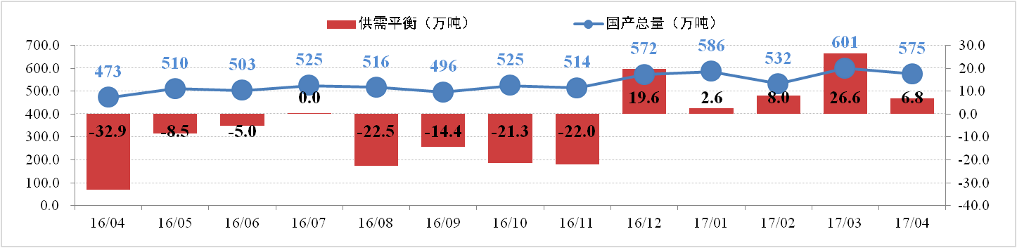 據(jù)行業(yè)統(tǒng)計(jì)數(shù)據(jù),目前全國氧化鋁總產(chǎn)能為7723萬噸,開工產(chǎn)能7071萬噸,開工率91.56%。4月份氧化鋁產(chǎn)量約575萬噸,同比增加17.2%。減復(fù)產(chǎn)方面,中鋁河南80萬噸置換產(chǎn)能逐步投產(chǎn);中鋁山西、中鋁中州、中鋁遵義分別減產(chǎn)80萬噸、25萬噸和30萬噸產(chǎn)能;三門峽義翔60萬噸產(chǎn)能減產(chǎn)檢修。4月份國內(nèi)氧化鋁供給存在約6.8萬噸的過剩。