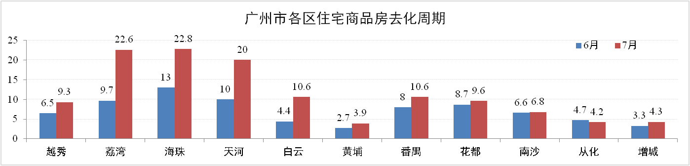截至7月底,由于近期成交量回落,廣州住宅地產去化周期上升至7.2個月,總體庫存量為643.54萬㎡。其中,海珠、荔灣、天河三區去化周期明顯上升,荔灣區為22.8個月,居于全市首位。而黃埔、增城等區因價格相對較低,剛需較強,去化周期僅剩4個月左右。
