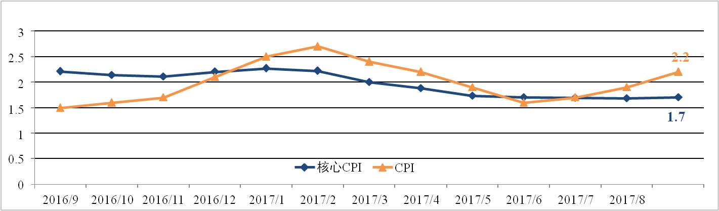美國9月物價指數(shù)增速回升,但略低于市場預期。9月美國CPI為2.2%,較 上月擴大0.3個百分點,核心CPI為1.7%,與上月基本持平。颶風襲擊美國產(chǎn) 油區(qū)造成能源產(chǎn)能下降推高原油價格是CPI上漲的主要原因。