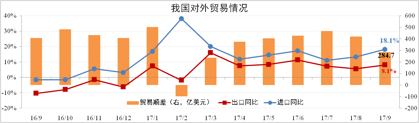 分析認為:9月進口大幅上升一方面反映國內需求韌性較強,下滑不顯著,另一方面環保造成生產受限,需要更多的進口來彌補國內生產的不足。對美順差擴大或對特朗普11月訪華提供談判籌碼,對出口造成不利影響。