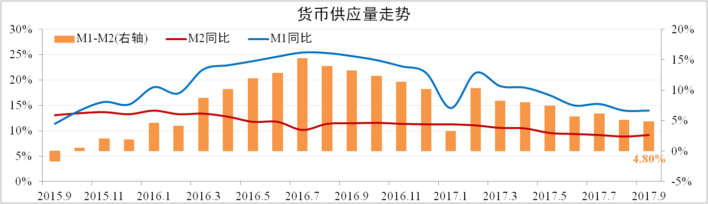分析認為:受上游盈利轉好以及產能擴張受限影響,企業部門融資需求有走弱趨勢。另外“金九”慘淡收場,房產調控趨嚴,旺季不旺。綜合來看,M2回升動能不強。預計10月貨幣供應依然偏弱。