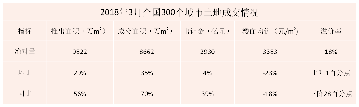 3月全國300城市土地市場總成交面積為8,662萬m2,環比增加35%,同比增加70%。其中,住宅用地成交面積3,053萬m2,環比增加29%,同比增加69%。土地溢價率為18%,環比上升1個百分點,同比收縮28個百分點。