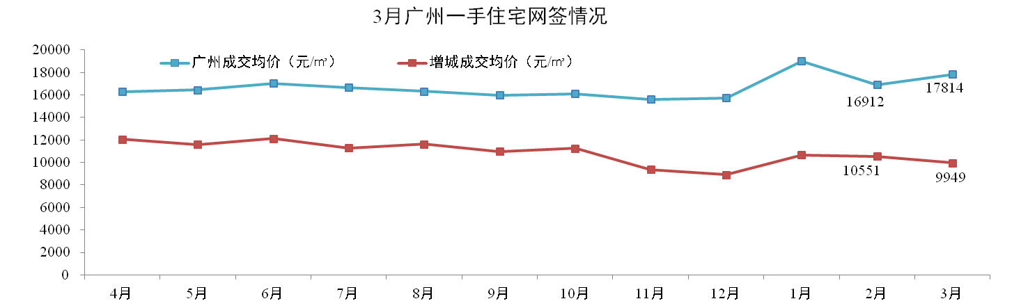 網簽價方面:3月份廣州一手住宅成交均價17,814元/m2,環比上升5.33%。其中,增城成交均價9,949元/m2,環比下降5.71%。