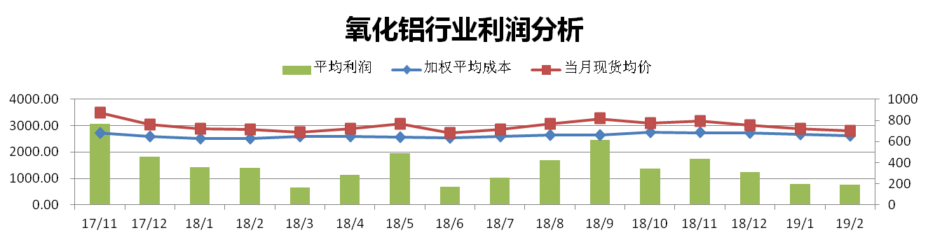 2月份國(guó)內(nèi)氧化鋁加權(quán)平均成本為2622元/噸,較上月下降2.02%。當(dāng)月全國(guó)氧化鋁現(xiàn)貨成交均價(jià)為2812元/噸,較上月下降2.19%。理論氧化鋁行業(yè)平均利潤(rùn)水平為190元/噸。