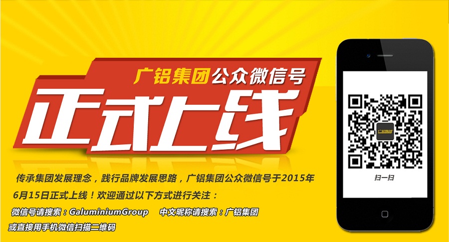 廣鋁集團(tuán)公眾微信號(hào)已認(rèn)證開(kāi)通并上線(xiàn)運(yùn)行,歡迎廣大朋友及客戶(hù)關(guān)注廣鋁集團(tuán)微信公眾號(hào)。我們有理由期待,廣鋁集團(tuán)公眾微信號(hào)將會(huì)帶給廣大朋友及客戶(hù)更加值得期待的服務(wù)。