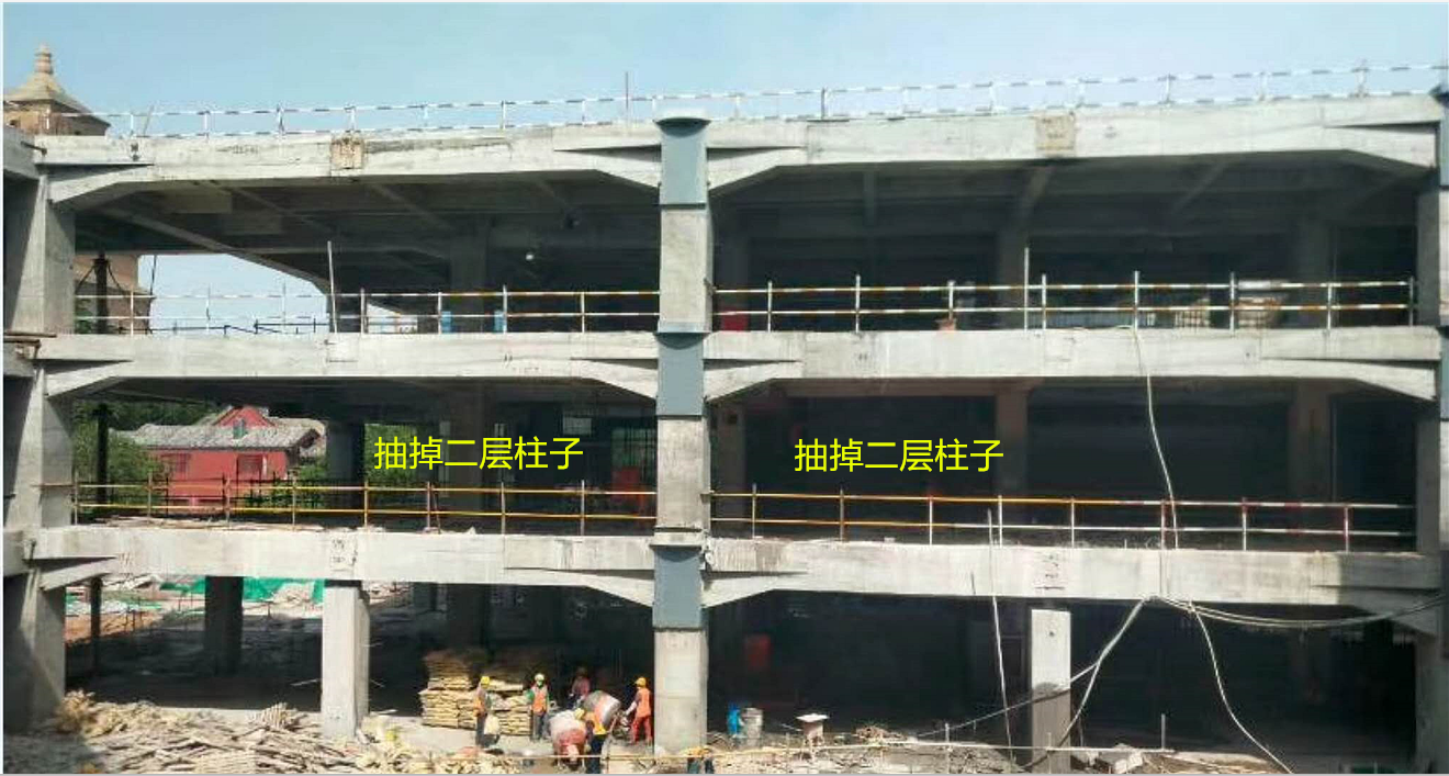 該項目難點在于托梁抽柱技術復雜,施工難度大,且工期緊,我公司在技術上大膽創新,優化施工方法,在垂直方向上同一位置同時拔掉3根柱子。