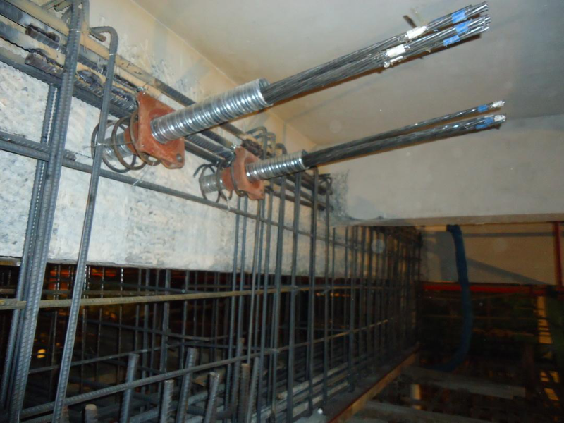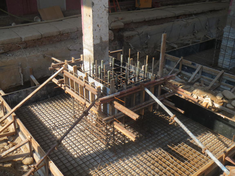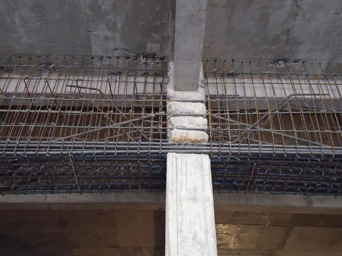 托梁拔柱設計構造,對于設置托梁方案,托架兩端在旁柱上的支承固定,一般是采用現制牛腿來實現,旁柱上端若為薄壁工字形載面時,也可直接開鑿孔洞支承。牛腿中的鋼筋一般是采用索安卡化學植筋技術在鋼筋混凝土柱上生根,柱應局部鑿去保護層。若采用外包封閉式鋼板套箍的抗剪能力,套箍應與柱主筋焊接,或者附加預應力螺栓或打孔穿入方鋼銷等。當為鋼柱時,牛腿與柱可直接焊接。對于無支撐托梁拆墻,一般是采用雙面鋼筋網混凝土夾板墻對原上部(磚)墻加固,再與托梁組合為一根墻梁,以增大抗彎剛度,且在梁中配置定量的后張預應力筋,利用預應力時的反拱來抵消拆墻后的部分撓曲變形。