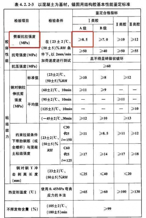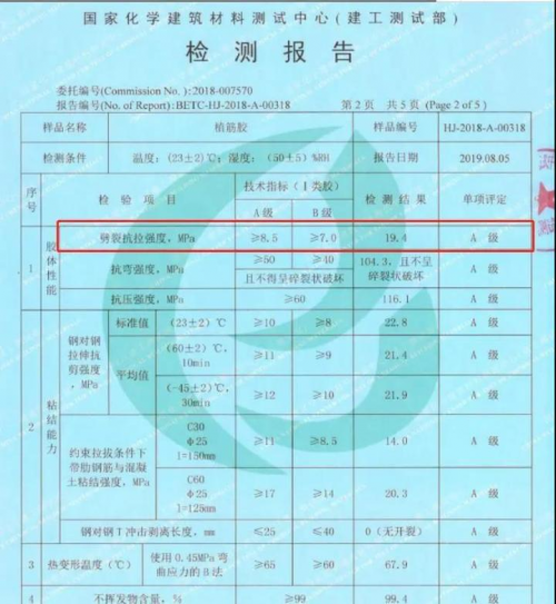 而植筋膠多被用在鋼筋混凝土結構中,同樣其劈裂抗拉強度也是很重要的參考指標,它指的是塑性變形直到出現裂源,材料所能抵抗的最大拉力下的強度,主要反映植筋膠的錨固力,意義重大。